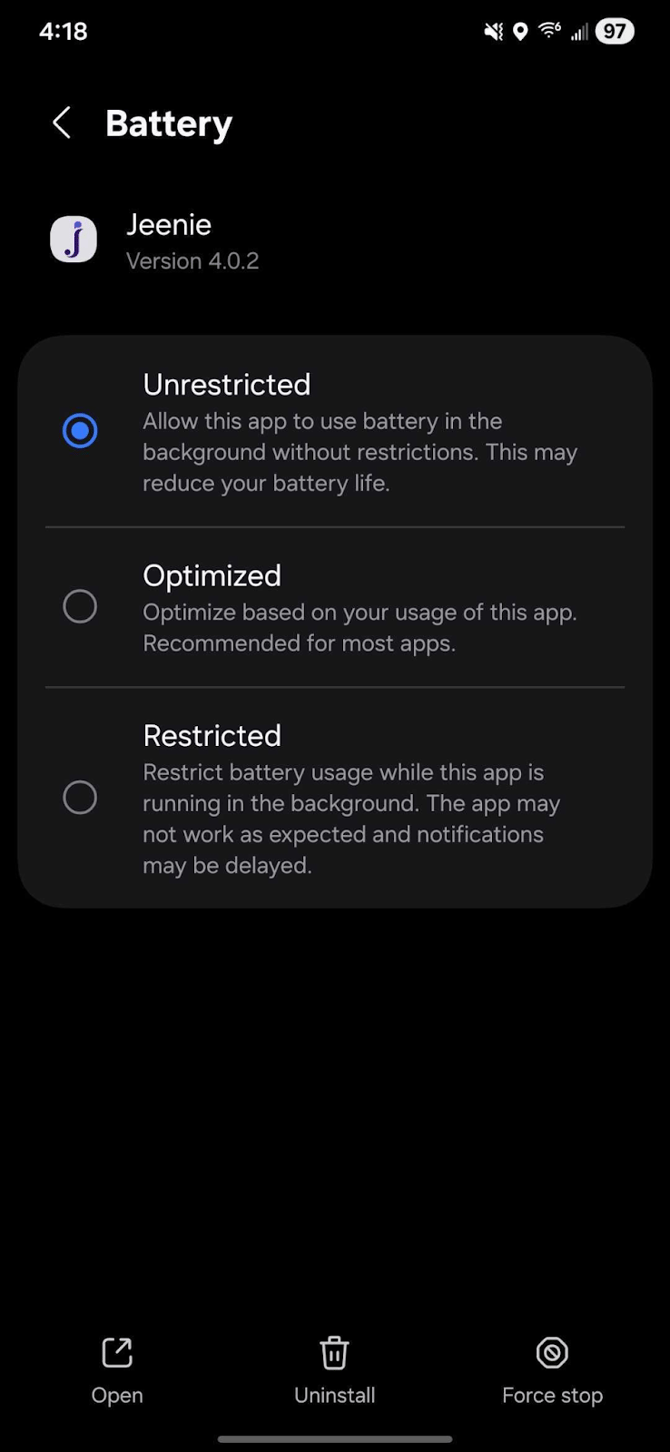 Android’s default battery optimization can sometimes "silence" apps running in the background to save power. Setting Jeenie to Unrestricted ensures your call remains active.